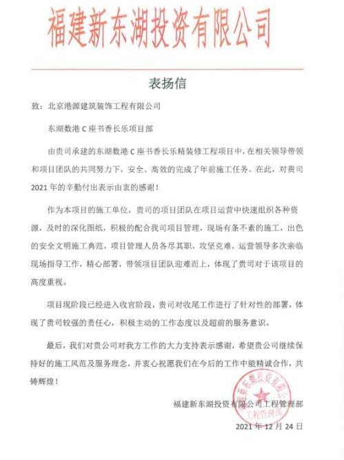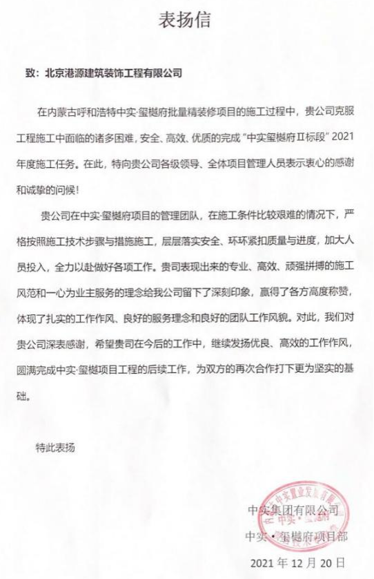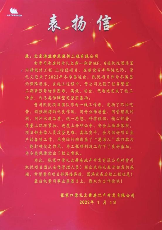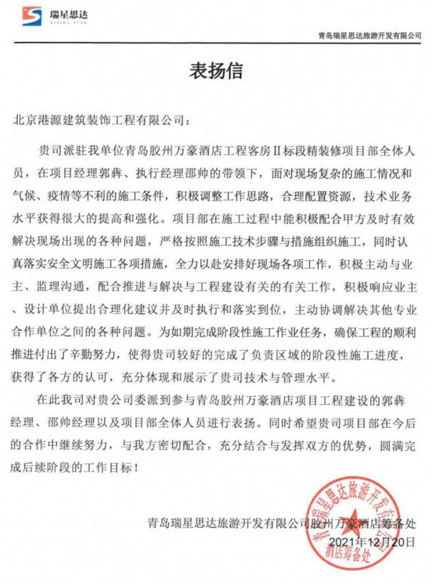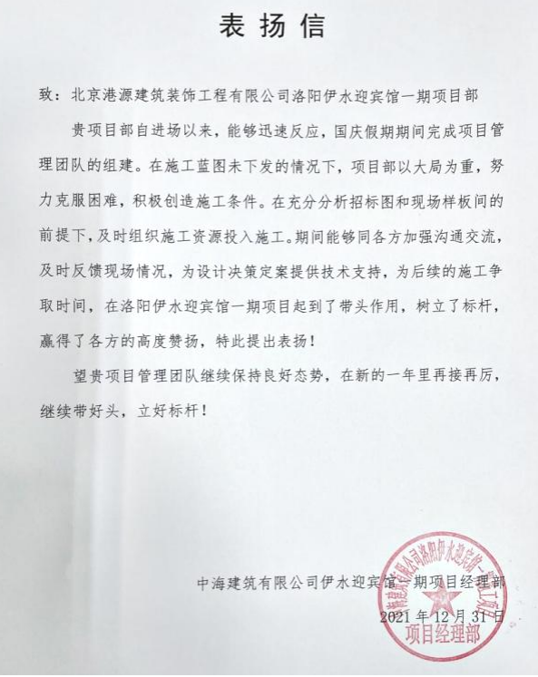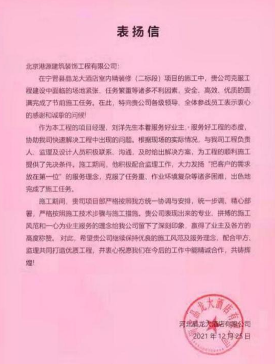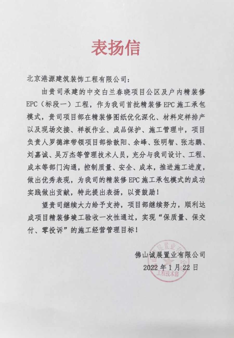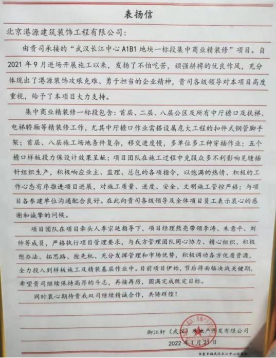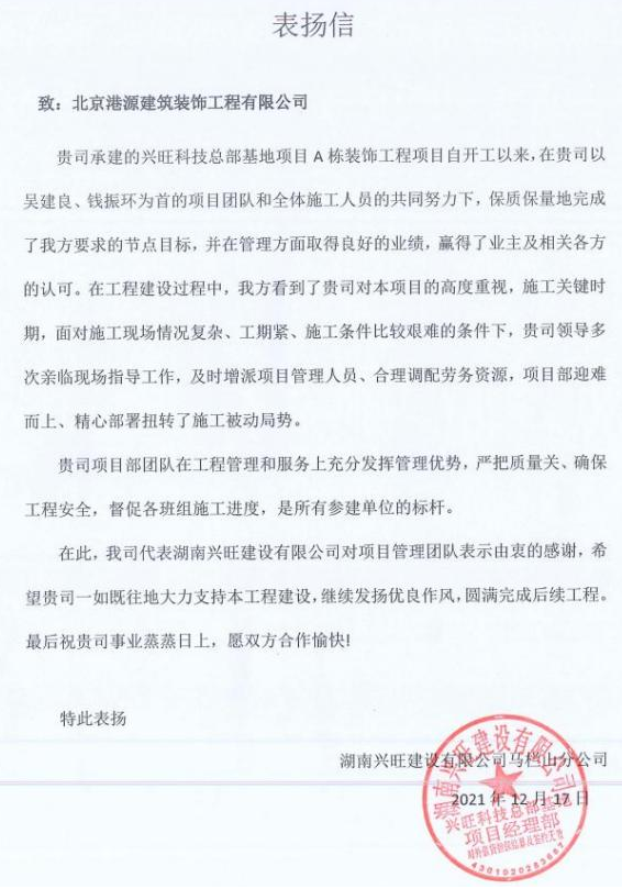 一封封表?yè)P(yáng)信、感謝信,是對(duì)港源品牌的認(rèn)可,也是對(duì)全體項(xiàng)目管理人員付出的肯定,更是鞭策我們不斷提高服務(wù)質(zhì)量的動(dòng)力。在今后的施工管理服務(wù)中,北京港源將堅(jiān)持以“讓客戶(hù)更滿(mǎn)意”為宗旨,以適應(yīng)客戶(hù)的多樣化需求。