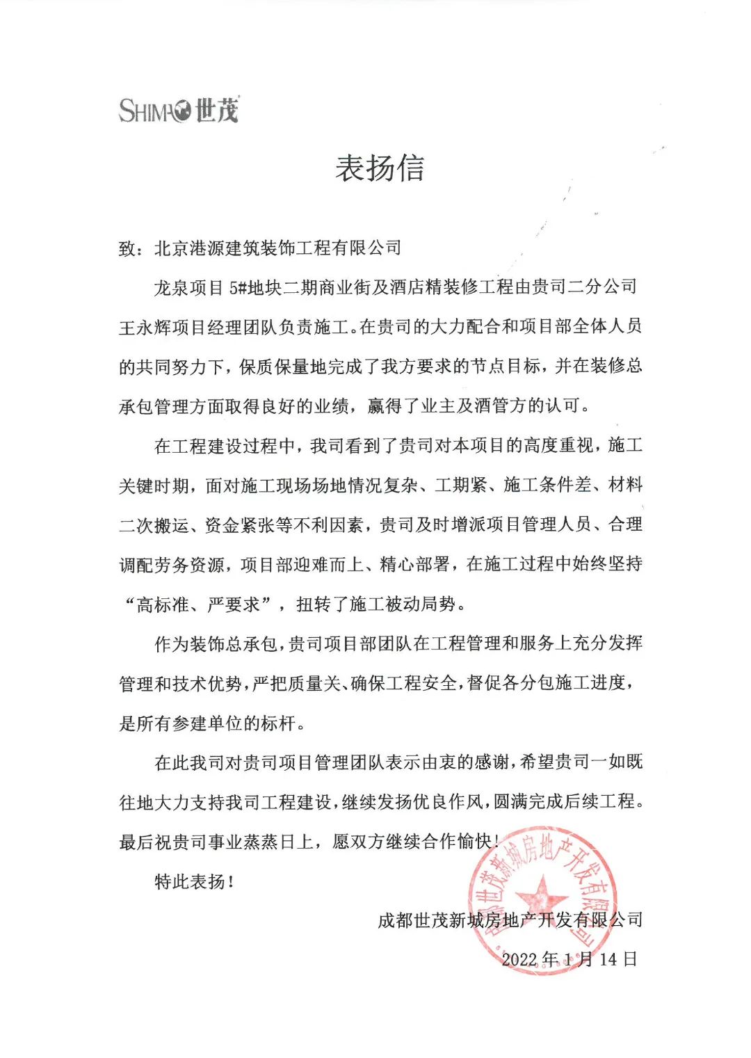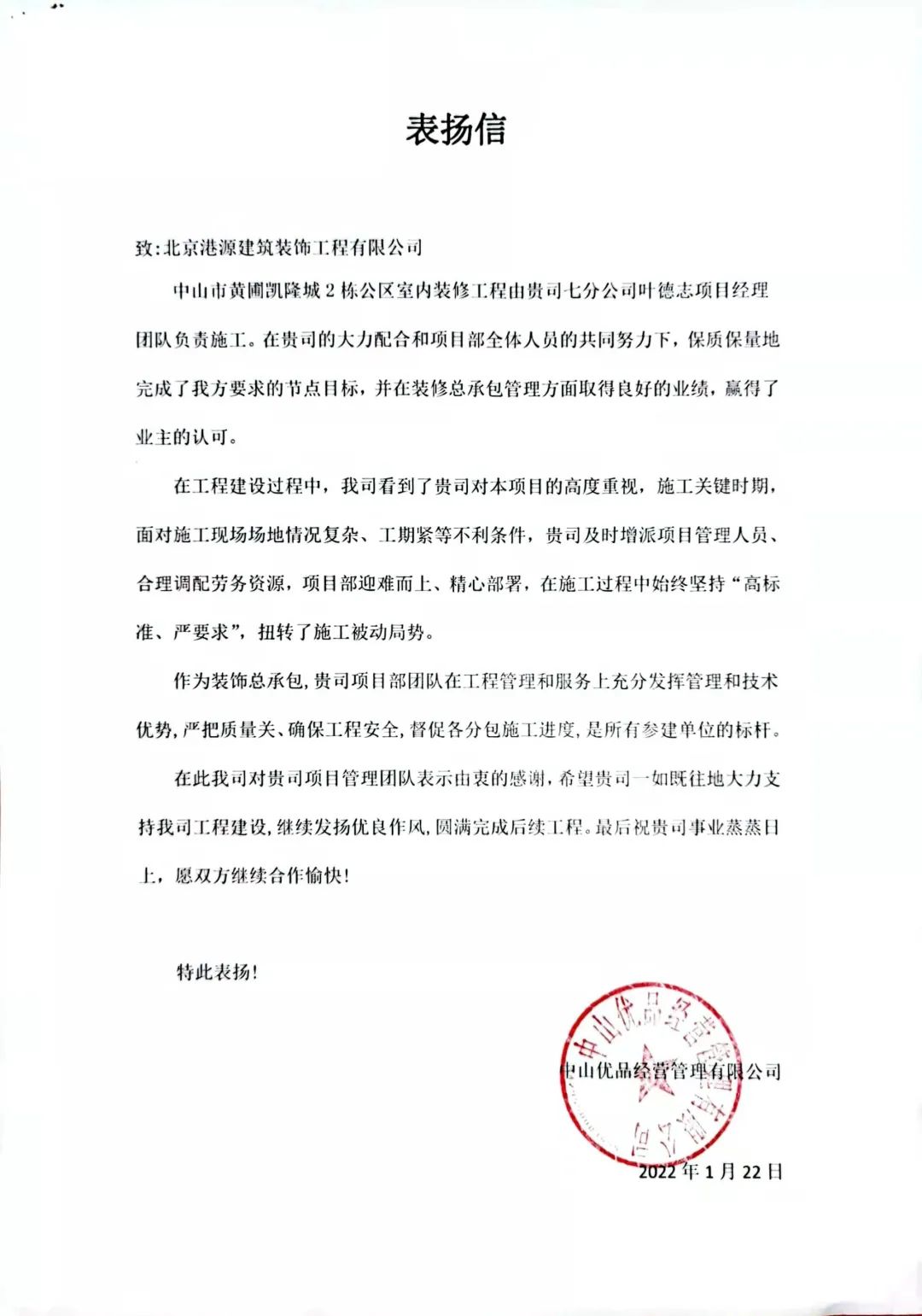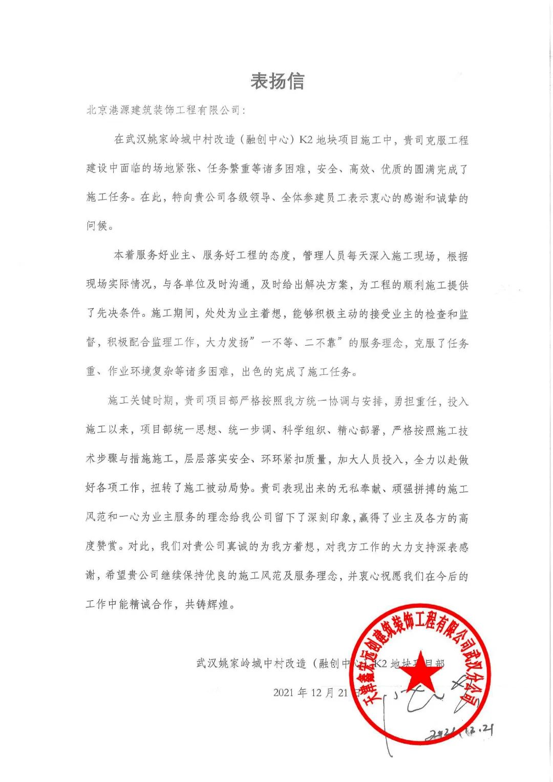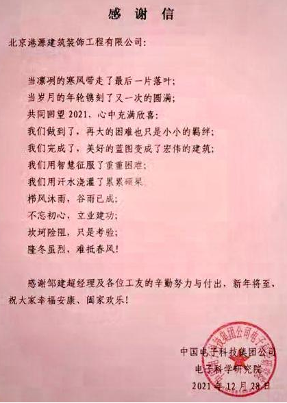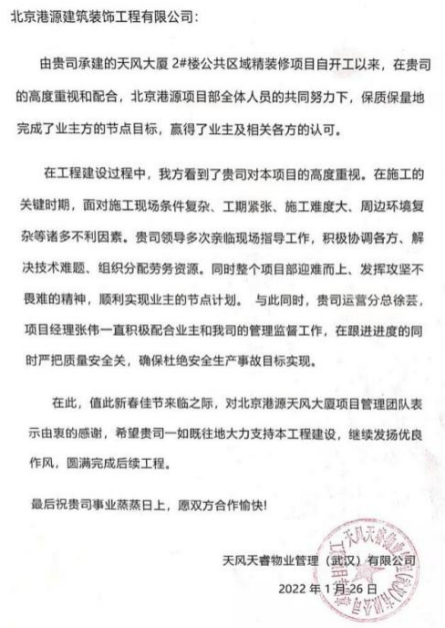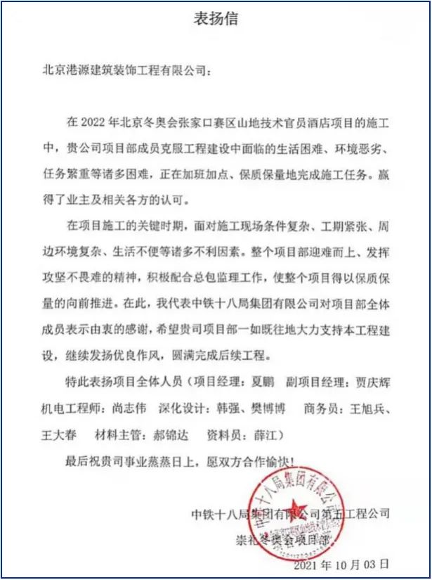 一封封表?yè)P(yáng)信、感謝信,是對(duì)港源品牌的認(rèn)可,也是對(duì)全體項(xiàng)目管理人員付出的肯定,更是鞭策我們不斷提高服務(wù)質(zhì)量的動(dòng)力。在今后的施工管理服務(wù)中,北京港源將堅(jiān)持以“讓客戶(hù)更滿(mǎn)意”為宗旨,以適應(yīng)客戶(hù)的多樣化需求。
