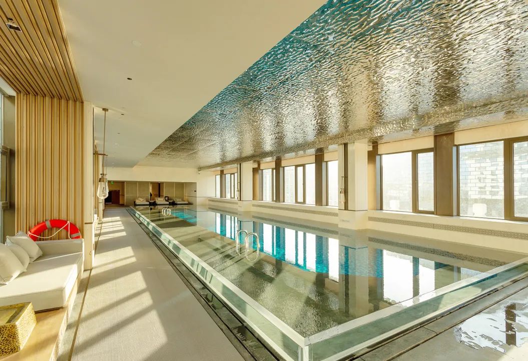 高層泳池位于酒店五樓,在擴(kuò)大使用面積的同時升級改造為無邊泳池,屬于酒店施工的重點(diǎn)控制區(qū)域。港源項目團(tuán)隊在泳池施工過程中嚴(yán)格把關(guān),采用透明材質(zhì)作為護(hù)欄,當(dāng)池水恰好漫過護(hù)欄便呈現(xiàn)出無邊水面效果,完美實現(xiàn)了設(shè)計初衷。