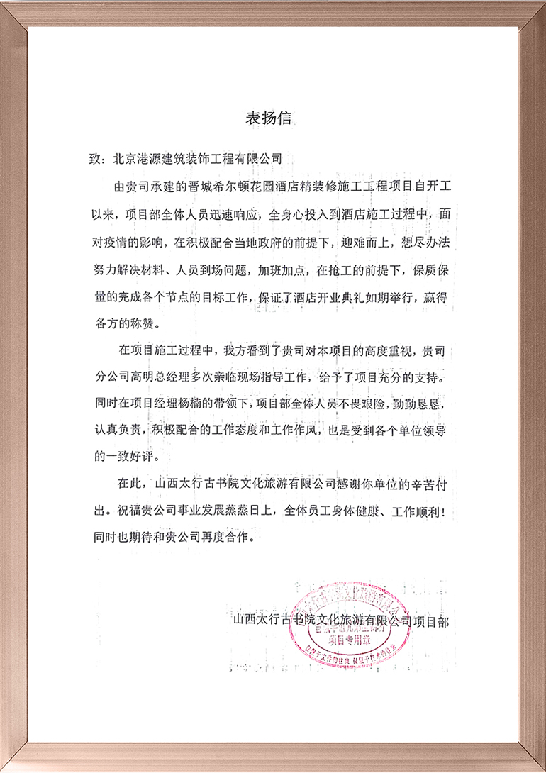 2022年9月,希爾頓集團(tuán)宣布晉城古書院希爾頓花園酒店正式營業(yè)。山西希爾頓花園酒店是山西華誼兄弟星劇場的配套項(xiàng)目,是山西省第一家希爾頓集團(tuán)酒店。項(xiàng)目由晉城古書院文化旅游有限公司投資興建,由希爾頓集團(tuán)運(yùn)營管理,室內(nèi)全部區(qū)域的精裝修工程由港源裝飾負(fù)責(zé)施工。